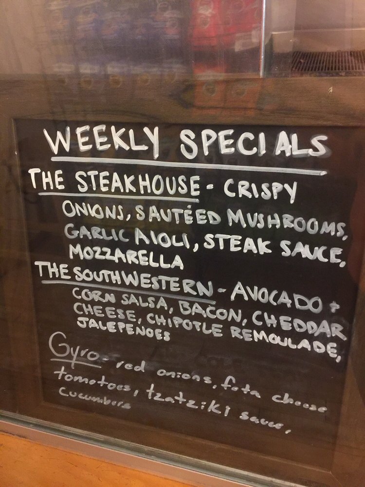 Indulge in a pizza with everything! Saucy steak, Fries and salami topped with cheese, tomato suace, mustard and mayonnaise.
